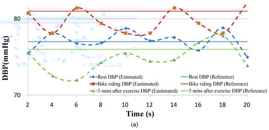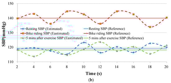 After parameter calibration in the first stage, the participants were requested to rest for 5–10 min to allow their BPs to return to normal levels before the second stage of the experiment. In the second stage, the participants’ BP values were estimated using the calibration parameters and Equations (6) and (7). These estimations were performed as determined in the previous stage and according to the participants’ signals detected using the strain-based pulse wave sensor and the PPG sensor. BP values were measured before and during exercise and after a 5-min rest.