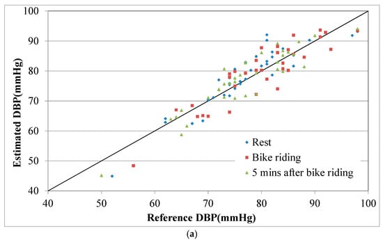Scatter plot of participants’ reference and estimated BPs. (a) DBP and (b) SBP.
