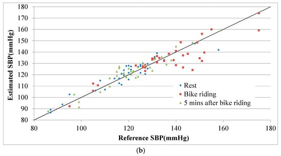 Table 1 lists the estimation errors in and averages of the estimated BPs for the 39 participants. Before the bike-riding exercise, the DBP and SBP errors for the participants’ data were both small. For the data collected during the bike-riding session, the SBP error increased, which was attributed to fact that SBP typically changes during exercise. For the data collected after participants’ 5-min rest, both the DBP and SBP errors were higher than those for the initial rest period. At this stage, some participants’ radial arteries had moved slightly out of the strain sensor’s range because of the exercise, which caused higher estimation errors. The estimated and reference BP values for all participants are plotted in Figure 14. Most of the estimated and reference BP values were well correlated, and the errors were independent from the BP values.