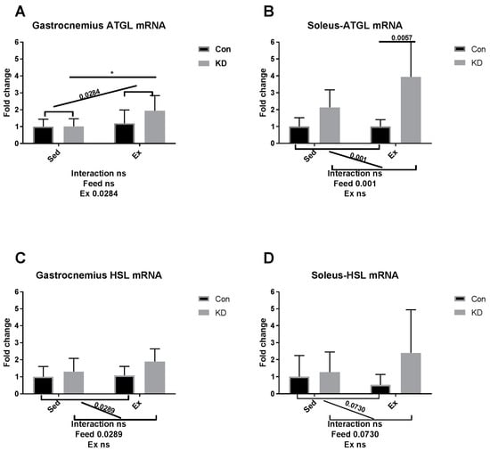 mRNA expression of lipolytic enzyme in adipose tissue immediately after exhaustion. HSL: hormone-sensitive lipase. ns: no significance observed. * p < 0.05 and ** p < 0.01. Significance between groups are marked using slashes.