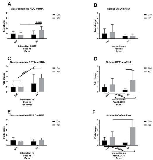 As shown in Figure 7A,C,I in white, fast-twitch muscle, carnitine palmitoyl transferase (CPT)-1alpha, acyl-CoA oxidase (ACO) and hydroxyacyl-coenzyme A dehydrogenase (HADH) mRNA expression levels were enhanced by a KD after exhaustive exercise. As shown in Figure 7D,F,H,J in red slow-twitch muscle, the diet played as a main factor regulating FAO. CPT-1alpha, medium chain acyl-CoA dehydrogenase (MCAD), malonyl-CoA decarboxylase (MCD) and HADH mRNA expression levels were all enhanced. Exercise also enhanced HADH mRNA expression (Figure 7I,J), indicating that HADH activity may be enhanced by exercise alone. The results combined indicate that KD contributes to an enhanced mRNA expression of FAO-related enzymes.