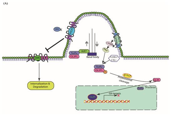 In the absence of an Hh ligand, PTCH1, a 12-pass transmembrane receptor, localizes at the base of the primary cilium (PC), a subcellular membrane extension that is important for the distribution and function of most of the components in this pathway. PTCH1 then destabilizes SMO by repressing its ciliary accumulation and consequently inhibits SMO activity, which is an essential step for activating this pathway in mammals (but not in Drosophila) [85]. The full-length GLI is therefore sequentially phosphorylated at multiple sites in the C-terminal region by protein kinase A (PKA), glycogen synthase kinase-3 (GSK3), and casein kinase 1 (CK1), [86]. The phosphorylated GLI protein directly binds β-transducin-repeat-containing protein (β-TrCP) in the Skp1-Cul1-F-box protein (SCF) ubiquitin–ligase complex via two binding sites; after that, it is subsequently ubiquitinated and degraded by the proteasome [87]. The truncated N-terminal GLI repressor (GLIR) then translocates to the nucleus and binds to Hh target gene promoters and switches off their expression in a sustained manner [88].