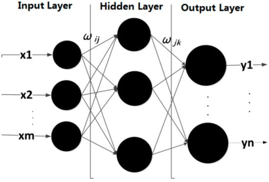 Back propagation neural network is a multi-layer feedforward neural network model. The corresponding signal is forward-propagating, and the error can be reverse-transmitted and corrected []. The s-type function is used as the transfer function between neurons, and the range of network output values is (0, 1). Back propagation neural network can deal with complex nonlinear problems well, and can provide the appropriate network model according to different training data. The structure of back propagation neural network consists of a three-layer model, including an input layer, hidden layer, and output layer []. The back propagation neural network model is shown in Figure 1.