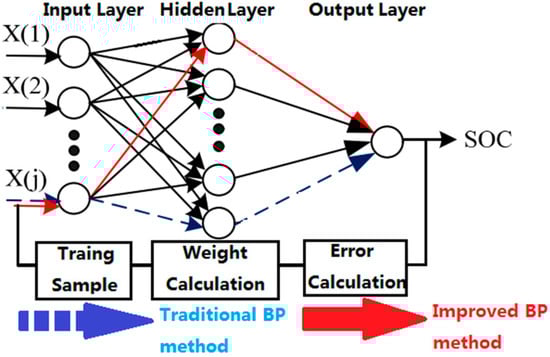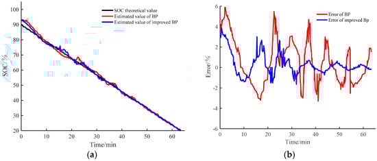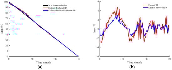 As can be seen in Figure 2, the improved BP neural network algorithm can quickly find the global optimal solution. The estimation error of SOC can be improved in theory. Corresponding weight and threshold correction follow Equations (7)–(10).