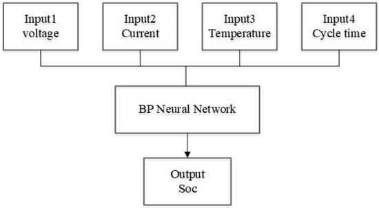According to the research on the characteristics of the target battery, a battery’s SOC estimation is mainly affected by voltage, current, and environment temperature. At the same time, in order to correct the rate of a battery’s circulating capacity attenuation in a timely manner, the number of charge and discharge cycles of the battery was added to revise the SOC estimation. After comprehensive evaluation and analysis, the input layer was determined to include four neurons.