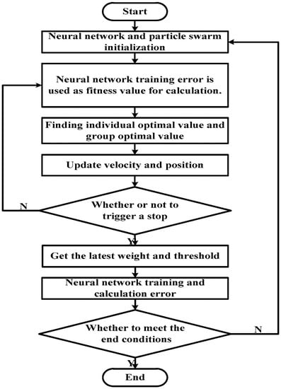 - The particle algorithm ends: the end condition is the maximum number of iterations that has been set or the point at which N steps is reached, and the mean square error of all samples can meet the requirements. If the end condition is not met, the particle fitness determination step is repeated, and the sequence is carried forward step by step. When the requirements are met, the iteration is stopped and returned to the optimal individual. The optimal value of the individual particle is the improved neural network weight, and the global optimal value is used as the adjustment threshold.