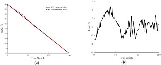 BP network estimation accuracy: (a) Comparison curves between SOC estimation and theoretical values; (b) the error curves of the estimation methods compared with the theoretical values.