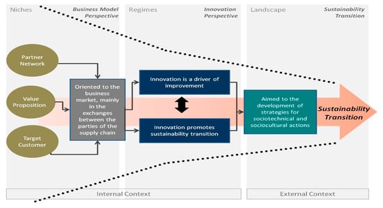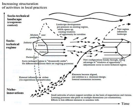 The MLP is a theoretical approach that is valuable for describing a real transition prospectto address the study of patterns, causes, and impacts of different phenomena in transition processes [,,,]. With an MLP perspective in Figure 1, the search for new transition elements departs from the construction of innovation and networks of actors, with all related aspects focused on a common goal.