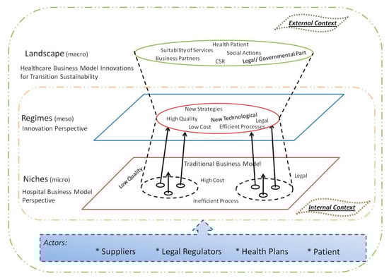 Within the transition context, different trends of change can take place in the context of business andsociety with social actions, adequacy of services, legal/governmental part, corporate social responsibility (CSR), business partners, and the principle the health patient []. The MLP perspective can be developed as a basis for solutions in the chain from the building of business models based on innovations among actors. These transformations can take environmental, social, cultural, and business levels not covered before and they can have a direct impact on how businesses are treated in the hospital context, in the health chain. Nevertheless, it is necessary to understand the involvement of the diverse actors and the transition [].
