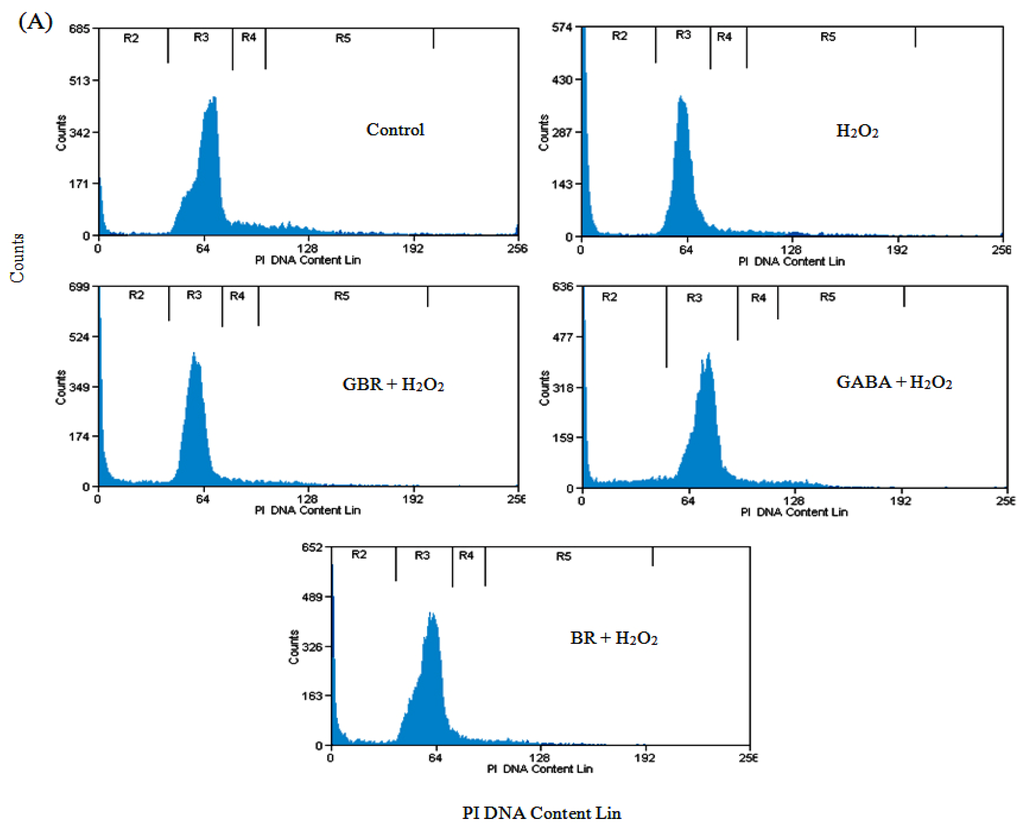 From our data, it can be seen that there was no significant difference in cell populations in S and G2/M phases among pretreatments with BR, GBR and GABA against H2O2. Activity at Sub-G0 phase indicating cell death was highest for H2O2 suggesting GBR and GABA had protective effects against cell death better than BR. This data supports our neurotoxicity data for BR pretreatment when compared to GBR and GABA.
