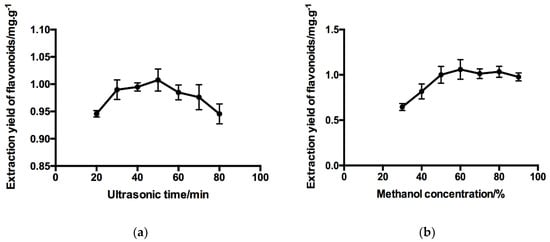 The ultrasonic time (20, 30, 40, 50, 60, 70, 80 min), methanol concentration (40%, 50%, 60%, 70%, 80%), extraction temperature (20, 30, 40, 50, 60, 70, 80 °C), and the ratio of solvent to material (10:1, 15:1, 20:1, 25:1, 30:1, 35:1, 40:1 mL/g) were investigated for the effect on the extraction of flavonoids from Sophora flavescens according to the method described in Section 2.3.