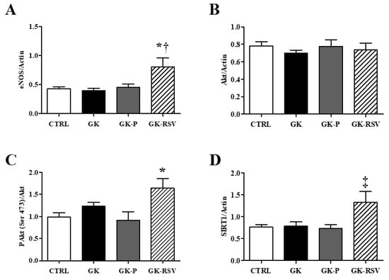Protein expression of eNOS (A), Akt (B), PAkt (Ser 473) (C), and SIRT1 (D). Representative western blot of eNOS (E), Akt and its phosphorylated form (F), and SIRT1 (G). Data are expressed as means ± SEM and one-way ANOVA to compare the groups. * p < 0.05 vs. CTRL and GK-P; † p < 0.01 vs. GK; and ‡ p < 0.05 vs. CTRL, GK, and GK-P.