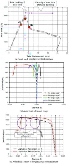 Figure 6a shows the axial load–displacement interactions. The maximum strength of this specimen was 3700 kN. After the maximum strength of the column was reached, the strength reduced rapidly due to the buckling of longitudinal reinforcement or yielding of the transverse reinforcement, which is shown in Figure 6b,c. We confirmed that the strains of longitudinal reinforcements changed from the compressed state to the tensile state, which is shown in Figure 6c.