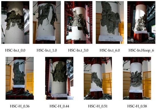Figure 7 and Table 2 show the images of specimens after testing. These specimens had two trends depending on the splicing of the transverse reinforcements. When the transverse reinforcements experienced yield failure, the crack and failure pattern had a 45° angle in the axial direction. The longitudinal reinforcements and the steel inner tube became buckled. If the transverse reinforcement was loosened, the concrete in that part was intensively destroyed, as shown in Figure 7 (HSC-In.t_0.0, HSC-In.t_1.0, HSC-H_0.44, HSC-H_0.58, HSC-D_300, and NSC-In.t_0.0). The inclination of the shear sliding plane with the horizontal axis varied from 25° for low-confined specimens to 45° for highly confined specimens.