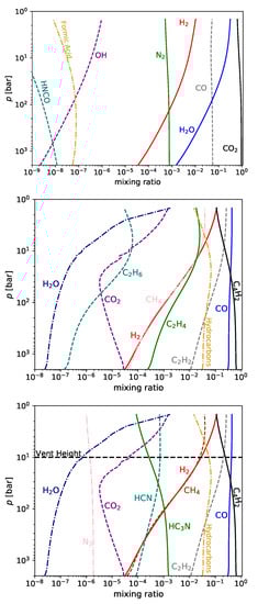 - Hu, R.; Seager, S. Photochemistry in Terrestrial Exoplanet Atmospheres. III. Photochemistry and Thermochemistry in Thick Atmospheres on Super Earths and Mini Neptunes. ApJ 2014, 784, 63. [Google Scholar] [CrossRef]