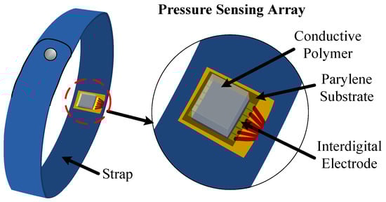 A schematic of the proposed blood-pressure monitoring system is shown in Figure 1. The pressure sensing array comprises a conductive polymer thin film and three pairs of interdigital electrodes patterned onto a flexible Parylene C substrate; it is packaged using thin Surlyn films and mounted on a strap. The conductive polymer film is patterned with microdome structures to enhance the sensitivity of the proposed device. Figure 2 illustrates the working principle of the device’s pressure-sensing element. As shown in Figure 2b, the microdome structures on the conductive polymer film deform when external pressure is applied, and, consequently, the contact area between the conductive polymer and the interdigital electrodes rapidly increases, which results in a sharp decrease in the contact resistance. This type of piezoresistive effect exhibits a much higher sensitivity than the typical bulk conductive polymer materials that employ the percolation theory [].