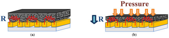 Working principle of the proposed device. (a) The initial shape of the conductive polymer. (b) The microdome structures deform as external pressure is applied.