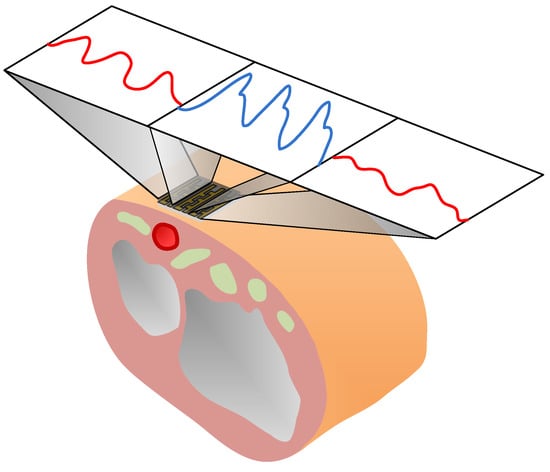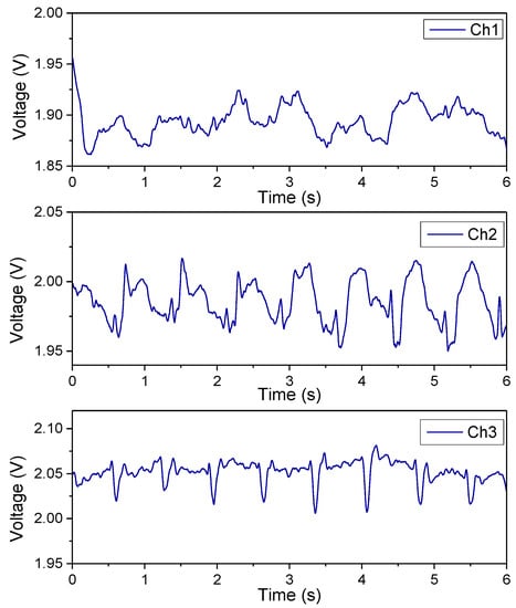 Figure 3 shows the advantage of using the array-type configuration for measuring the blood pulse wave, using the tonometry method. In general, it is difficult and troublesome to precisely align the sensor with the radial artery to capture high-quality signals []. As a result, in this work, the proposed device uses three pressure-sensing elements in a linear array. During pulse-wave measurements, at least one of the channels, which are positioned directly above the radial artery, gives the best signal quality, provided that the sensing array fully covers the skin above the radial artery. This array configuration may greatly facilitate blood pulse-wave measurements.