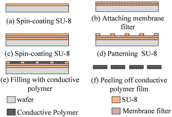 Figure 4 shows the process of patterning microdome structures on the conductive polymer surface. First, a layer of SU-8 photoresist (SU-8 2050, MicroChem Corp., Westborough, MA, USA) with a thickness of 200 μm was spin-coated onto a glass handling wafer (Figure 4a). A nylon-membrane filter, which served as the mold for the microstructures, was then placed on the photoresist (Figure 4b). Another layer of SU-8 photoresist, with a thickness of 200 μm, was spin-coated onto the membrane filter (Figure 4c), and then the photoresist was patterned to define the dimensions of the conductive polymer after a standard lithography process (Figure 4d). Subsequently, the prepared MWCNT/PDMS composite was filled into the SU-8 trenches (Figure 4e) and cured at 95 °C for 6 h. Finally, after removal of the SU-8 photoresist, the conductive polymer was peeled from the nylon-membrane filter (Figure 4f).