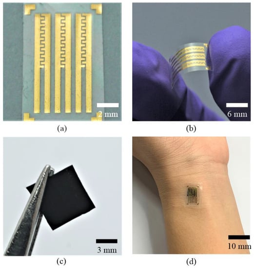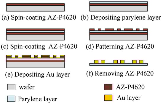 The fabrication of the flexible interdigital electrodes is described in Figure 5. First, a sacrificial layer of AZ-P4620 photoresist (AZ-P4620; MicroChem Corp., Westborough, MA, USA) of 3 μm in thickness was spin-coated on a glass wafer (Figure 5a). Next, a 30 μm Parylene C film was deposited onto the sacrificial layer as the flexible substrate for the electrode pairs (Figure 5b). Another layer of 3 μm AZ-P4620 photoresist was then spin-coated onto the layer of Parylene C (Figure 5c), and the interdigital shapes were transferred to the photoresist after a standard lithography process (Figure 5d). Next, a 300 μm Au layer was deposited onto the wafer (Figure 5e). After removal of the AZ-P4620 layer, the flexible electrode pairs were lifted off the handling wafer (Figure 5f).