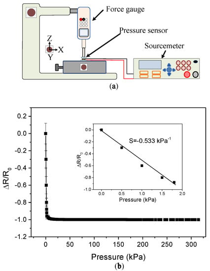(a) Measurement setup for the pressure-sensing array with pressure force. (b) The measured relationship between the pressure and the change in resistance.