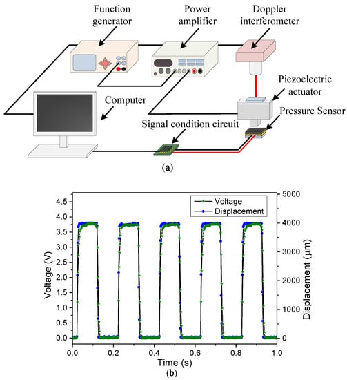 The dynamic response of the proposed sensing element was also measured and discussed. The experimental setup is shown in Figure 9a. A piezoelectric actuator (P-621.20 L, Physik Instruments Corp., Karlsruhe, Germany) was used to generate a displacement input for periodically pressing and releasing the sensing element. The actuator was driven by a power amplifier, which was connected to a function generator supplied with square wave signals. A PMMA block, 3 mm × 3 mm in cross-section, was attached to the head of the piezoelectric actuator. The transient motion of the piezoelectric actuator was measured by using a laser Doppler interferometer. Furthermore, the transient resistance variation of the sensing element was converted into a voltage output by a signal-conditioning circuit, which was connected to a PC equipped with a data-acquisition card. Figure 9b shows the measured transient responses. As shown in the figure, the responses of the sensing element slightly lagged behind the displacement input of the piezoelectric actuator by approximately 12 ms during the pressing–releasing cycles.