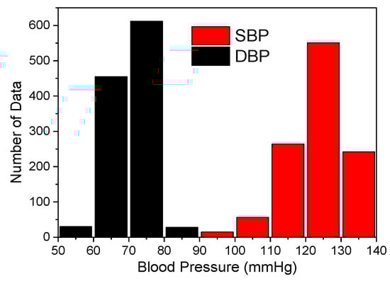 In this study, the proposed device obtained blood pulse-wave signals from 23 participants. In addition, the reference blood pressures were measured simultaneously using a cuff sphygmomanometer (HEM-7310, OMRON Industrial Automation Japan, Japan). Hence, the measured pulse wave signals corresponded to the simultaneously measured systolic blood pressure (SBP) and diastolic blood pressure (DBP). Figure 12 shows the histogram of the measured database. A total of 1128 datasets (i.e., measured blood pulse wave signals and the reference blood pressures measured by a cuff sphygmomanometer) were obtained. In the datasets, the SBP was in a range of 98 to 138 mmHg, and the DBP was in a range of 58 to 81.