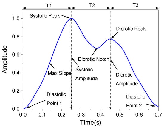 In order to remove noise and artifacts from the raw pulse-wave signals, the Hilbert–Huang transform (HHT) method was employed to process the data [,]. In general, the HHT includes two steps. In the first, the intrinsic mode functions (IMFs) are generated by using the empirical mode decomposition procedure. In the second, the new wave signals are reconstructed by ignoring the IMFs corresponding to noise parts. The comparison of pulse-wave signals before and after the HHT preprocessing is shown in Figure 13. Next, characteristic features related to blood pressure were are from each pulse wave [], such as the systolic peak, dicrotic peak, diastolic points, max slope, augmentation index, heart rate, and some important time-interval information. Figure 14 and Table 1 show the definitions of the extracted features used in this work.