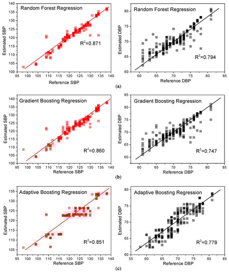 Systolic blood pressure- and diastolic blood pressure-estimated results with three different regression algorithms: (a) Random Forest Regression (b) Gradient Boosting Regression, and (c) Adaptive Boosting Regression.