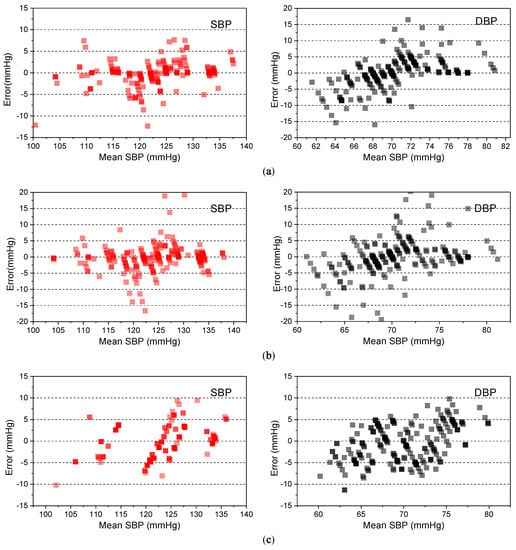 Figure 16 shows the Bland–Altman plots for the targets of SBP and DBP, created by using the estimation models generated by the regression algorithms. About 80% of the estimated SBPs and 70% of the estimated DBPs were within the error lines of 5 mmHg. Also, about 3% of the estimated SBPs and 5% of the estimated DBPs were beyond the error lines of 15 mmHg. Table 2 and Table 3 show the comparison between the proposed approaches and other approaches for blood-pressure estimation. As shown in the tables, the RFR-based algorithm gives a better accuracy than the other models, for blood-pressure estimation.