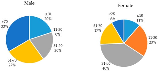 Out of the 50 patients investigated in this work, we had 35 females (0.7) and 15 males (0.3) with ages ranging from two months to 90 years. The distribution of infected patients based on gender and age is presented in Figure 1.