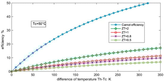 TEDs work on the principle that electric potential and heat can be seamlessly converted. The Seebeck effect states that electric potential can be generated between two junctions at different temperatures if the circuit is formed with two dissimilar metals. The Peltier effect, which is the reverse of the Seebeck effect, insists that the temperature can be controlled between two junctions if electric potential is applied between two dissimilar metals. TEDs use the Seebeck effect in power generation mode and the Peltier effect in thermal management mode, as shown in Figure 1. This versatility of TEDs is attractive for niche applications such as precise temperature control []. A TED consists of a large number of thermocouples formed by n-type and p-type semiconductor materials connected electrically in series and thermally in parallel. A thermoelectric module (TEM) generally consists of heat sinks on both hot and cold sides with interface and insulating layers to prevent heat diffusion to the cold side. It is obvious that the efficiency of the module is the sum of the efficiency of each element that forms the module, as shown in Figure 1. The conversion efficiency depends on the figure of merit  (Average value of ZT), as given by Equation (1). A higher value of ZT is preferred for the power generation and it was concluded by Bell [] that ZT > 1.5 is substantial for waste heat recovery applications. During the early period of development, the ZT value was mostly less than 1, but due to the advancement of materials a ZT of 2‒–3 is reported. The ZT values of different powers sources are displayed in Figure 2 []. For a given TEM, the maximum heat-to-electric conversion efficiency is given by Equation (2) and is proportional to the temperature of the hot, cold side and figure of merit ZT []. The variation of ZT values and corresponding efficiency is given in Figure 2. As a cooling device, the cooling efficiency is characterized by the COP as expressed in Equation (3):