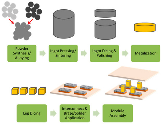 As the first step, the thermoelectric material has to be synthesized, typically through ball milling [] along with its constituents. The steps involved in the manufacturing of TEGs are displayed in Figure 3. Though the process is extensive, the required characteristics can be achieved once the optimized material composition is established. Another process by which thermoelectric powders can be obtained is through melting [], though there is some degree of process fluctuation resulting in a variation in phase and microstructures []. Synthesized powders are then formed into ingots, either by hot pressing or spark plasma sintering, and are subsequently diced to form thermoelectric legs. Material brittleness leading to chipping of thermoelectric legs is a predominant issue in this process, which may lead to further cracking []. Established manufacturing processes from semiconductor industries such as etching [], molecular beam epitaxy, electroless etching and vapour deposition [] are employed for manufacturing thin-film TEGs. Most commercially available TEGs are manufactured using bismuth telluride, while lead telluride and germanium are rarely used. The raw material cost of Bi2Te3 is $110/kg [], whereas if it is converted to pure thermoelectric material the cost is $806/kg []. The development of polymers, oxides and silicide drastically reduces the need to use germanium, thereby reducing the cost of the raw materials. The raw and pure thermoelectric material costs of oxides are $2/kg and $50/kg [], respectively. The cost of manufacturing TEGs varies based on the manufacturing process and the type of raw materials used. The total cost of TEG modules is also substantially shared by the components such as heat exchangers and substrates.