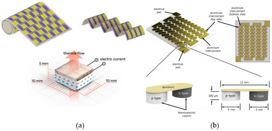 Due to the advent of flexible power electronics and wearable sensors, there is high demand for flexible power sources for applications such as powering sensors, and monitoring biomechanical motions. Flexible architectures of TEGs provide such flexibility without compromising the efficiency compared to rigid TEGs. Flexible TEGs employ novel polymers, composites, and are fabricated through innovative manufacturing methods such as additive manufacturing, printing, thermal spraying instead of conventional subtractive manufacturing. Polymers such as polyaniline exhibit good thermoelectric (TE) properties, which can be further optimized with conductive additives such as carbon nanotubes (CNT) with Au nanoparticles. A planar TEG was fabricated by doping a polyethyleneimine (PEI) solution onto CNT, demonstrating a power factor of up to 10−3 W/m−1 k−2 []. Printable and paintable TEGs are reported to adhere to various geometries. Research is ongoing to formulate suitable inks that have adequate wettability, viscosity and binder materials. A combination of organic and inorganic binders shows good electrical transport []. Rollup TEGs consisting of metal films coated on a polyamide roll by using an inject printer were demonstrated by Weber []. A special type of TEG known as Origami, which is flexible enough to be pasted on heat sinks, has the potential to replace batteries [], as shown in Figure 4.