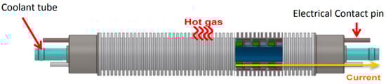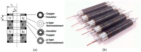 Cylindrical bulk TEGs are suitable to extract power from cylindrical objects such as cooling channels and automotive exhaust pipes where the heat flows radially. Cylindrical bulk TEGs are fabricated by using PbTe modules through a sintering process []. Manufacturing of ring-shaped TE materials with high homogeneity and density is a challenge. Long tubes of PbTe modules are made from p-type and n-type TE doped with PbTe and cut into the required lengths. The TE legs are separated by insulation rings and alternatively connected by inner and outer metallic tubes, as shown in Figure 5 []. The cartridge configuration shown in Figure 5 was developed for automotive applications and is optimized to operate with exhaust gas on the hot side and a water-glycol mix on the cold side. The heat exchangers customized for exhaust gas pipes operate in the temperature range of 400–650 °C on the hot side and coolant (water-glycol) in the temperature range of 40–100 °C. The thermoelectric elements are p-type and n-type, with their legs hermetically enclosed in inert gas. The enclosure, consisting of a heat exchanger on the outer hot surface and a cooling tube on the inner cold surface of the cartridge, is illustrated in Figure 6. The cartridge was assembled on a SUV-BMW X3 (BMW AG, Research and Innovation Center: Munich, Germany) [] to generate power in the range of 0.5 to 2 kW. The electrical power obtained from this four-ring prototype is 30 mW when a temperature difference of 70 K is maintained across the inner and outer surfaces of the thermoelectric tube [].