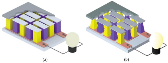 Flat bulk architecture TEGs are widely employed for high power generation to exploit the longitudinal Seebeck effect []. The flat bulk TEGs are mostly cuboid in shape, with electrical and thermal current running parallel to each other. The flat bulk TEGs are constructed with alternating legs of p-type and n-type TEM by a powder processing or sintering technique. Metallization layers are constructed on both sides of the legs with highly thermal conductive materials such as alumina (Al2O3) or aluminium nitride based on the cost. Extensive studies are in progress to enhance the performance of flat bulk TEGs through geometric factors and TE legs arrangement []. TEGs with square or pyramidal TE legs are illustrated in Figure 7. The effect of the number of TE legs and their dimensions was studied by Hodes []. The shapes of TE legs such as pyramidal, cuboid or quadratic were studied by Mijangos []. TEGs with pyramidal TE legs are found to generate 70% more power than cuboid ones. The flat bulk TEGs are used in waste heat recovery and concentrated solar radiation applications. Flat bulk TEGs have been used in experiments in the automotive field and generated up to 1 kW [] from waste heat. The use of TEGs in concentrated solar radiation can greatly reduce surface contact loss such as heat loss and thermal contact resistance. Studies on the photo thermoelectric effect open up new areas of application