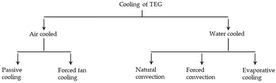 As TEGs exploit the temperature difference between their two sides, maintaining a higher temperature difference will help with increasing the power yield. The hot side of the TEG is in thermal contact with a heat source such as a waste heat pipe or concentrated solar radiation, while the cold side temperature is kept low by cooling it to the maximum possible extent. The widely employed cooling methods of TEGs, and their classifications, are shown in Figure 8. All the heat that is incident on the hot side will not be converted into electricity, as a vast amount of heat ends up heating the device. To maintain the temperature difference, the heat that is diffused from the hot side must be dissipated from the cold side. Significant studies in the past have contributed to the hot side thermal management [], whereas cold side thermal management has not received sufficient attention. Since designing a successful TEG involves choosing the right cooling method based on factors such as TEG side, amount of heat flux, cost and space availability, this section has been dedicated to providing an overview of cooling mechanisms and their impact on the power generation of TEG.