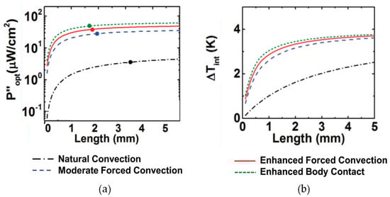 (a) Power output comparison of different cooling methods for different leg lengths; (b) temperature difference for different lengths [].