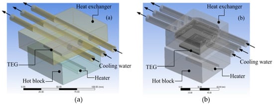 Forced water cooling is efficient in terms of heat extraction compared to the methods discussed above, though a significant parasitic loss does exist when delivering water at the required flow rate. Various operating parameters such as hot and cold side temperatures, flow rate and convection efficiency were studied by Niu []. The maximum efficiency of 4.44% at the power output of 146.5 W was achieved with a coolant at 30 °C. In the case of STEG, forced water cooling was researched extensively. A microchannel heat sink was designed to cool the individual thermopiles and was able to generate 4.9 W at electrical efficiency of 2.9% when the temperature difference was 109 °C []. Yazawa [] was able to achieve 1% convection efficiency by using ambient water and a Fresnel lens. Most studies on STEG use a parabolic concentrator and forced water cooling, and on average they are able to generate 64.8 W of power at 1.59% efficiency []. Advances in computational fluid dynamics, together with sophisticated computer models, are able to predict the total system efficiency, as indicated by Aranguren []. Heat transfer also depends on the type of heat exchanger design. A comparative study of the tube and fin heat exchanger reveals that the fin exchanger design performs better, especially at low Reynolds number flows []. The exchanger designs are shown in Figure 10. Further investigation is required on system design including optimization of pumps, coolant, flow rate, heat exchanger design and piping to reduce parasitic loss.