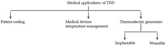 TEDs have been widely used in the past for temperature management of patients and medical devices, where reliability and noiseless operation are of higher importance than COP. TEDs are increasingly replacing devices that once relied on refrigeration cooling, based on a vapour compression cycle. Ultra-small sensors and next-generation wearable devices, along with the Medical Internet of Things (MIoT) [], have positioned TEGs as primary micro energy harvesters. This section reviews the role of TEGs in wearable and implantable applications, typical power requirements of sensors, available energy harvesting techniques, and design of TEGs for such applications. The application of TEGs in medical applications can be broadly classified as shown in Figure 12.