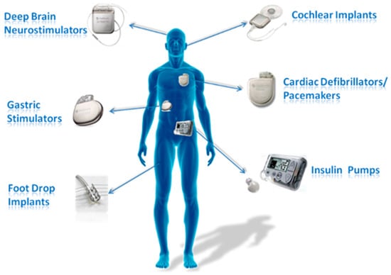 TEGs are expected to play a key role in a growing number of implantable devices. This section investigates the feasibility of embedding a TEG into the human body, in vitro and in vivo experiments and their results, limitations, and future prospects. Implantable devices substitute for certain functional organs of the body and have to be in operation for the lifetime of the patient. These devices can be powered either by storing electricity or generating it on site. Some common implantable devices are shown in Figure 13 [].