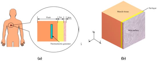 (a) TEG embedded in three-layer human tissue; (b) cubic domain of human tissue [].