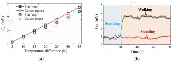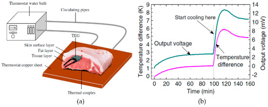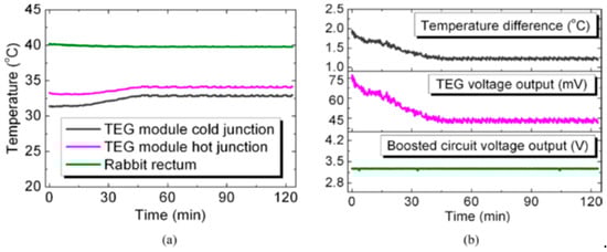 (a) Temperature profile of TEG and rabbit rectum; (b) output voltage in relation to temperature difference [].