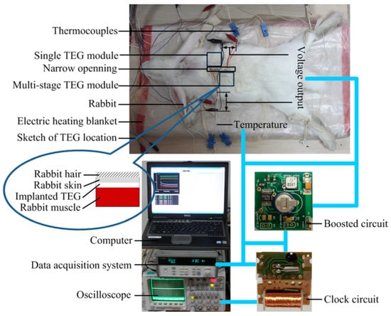An in vitro study has been conducted with a pork fillet of size 80 mm × 80 mm to simulate the human body with fat layer of thickness 10 mm and skin layer of thickness 2 mm. The constant heat source is a copper plate at 310 K with thermostat and ambient temperature of 291 K. A TEG was embedded with cold side interfacing between fat and muscle tissue as depicted in Figure 15. It was found that when the temperature difference is 0.5 K after stabilization, the output voltage of a single TEG is 3.3 mV. As shown in Figure 15b, the start of cooling indicates the time when a piece of ice is placed to increase the temperature gradient to 1.1 K, resulting in a TEG output of 6 mV. Though this experiment sheds some light on the capability of TEGs, an important factor of thermoregulation by the body has not yet been accounted for. Hence, an in vivo study will give a realistic output of TEG. A single TEG was embedded inside a rabbit weighing 3.2 kg, as shown in Figure 16. As the TEG output was unstable, it was connected to a booster circuit with a DC/DC converter. The output of the TEG and the voltage generated are shown in Figure 17. The in vitro study concluded that a functional circuit, booster circuit is essential, along with a thermocouple array (TEG), to power an implantable device.