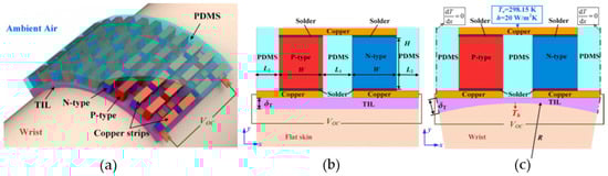 - Wang, Y.; Shi, Y.; Mei, D.; Chen, Z. Wearable thermoelectric generator for harvesting heat on the curved human wrist. Appl. Energy 2017, 205, 710–719. [Google Scholar] [CrossRef]