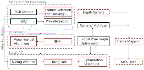 Core system structure. The solid line blocks indicate the original core pipeline of VINS-Mono. Red solid line blocks represent the modules of VINS-Mono that we modified. Red dashed line blocks represent the modules we newly added. VINS-Mono starts with the input of a color image sequence and IMU flow. IMU values are pre-integrated between every color frame, while visual features are detected and tracked. Then, the data is passed to SFM (Structure From Motion) to get an up-to-scale pose estimation. Once the visual and inertial alignment and initialization are done, the system starts to do a sliding window based local VIO process and is using the global pose graph optimization module to achieve the loop-closure task. The camera pose is then in a global consistent configuration.