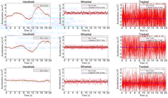 Acceleration values of handheld, wheeled robots and tracked robots shown separately. The left column is three-axis acceleration under normal handheld motion, the middle column is the acceleration of a wheeled robot which is driving a circular motion. The right column is the acceleration of a tracked robot which is under a uniform, linear motion. The red curves indicate measured raw acceleration values of the IMU sensors and the blue curves in the two right columns indicate the acceleration values after a lowpass filter.