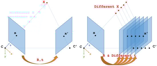 Illustration of 3D point projections on 2D images. C and are camera centers at different times with a rotation and translation R, t between them. X is a 3D point. X, R and t are unknown in monocular VINS. In the left image RGBD is used and the depth of the pixels is used to get X and PNP [,,] is used to get R, t with constant scale factor. The right image illustrates the unknown scale factor when using just RGB. By having at least 5 point pairs like x and , five-point algorithm [] can be applied to get solutions.