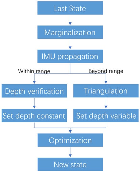 Once we have all features in the window with their verified depth, the camera visual residual, i.e., the reprojection error, can be calculated. With IMU residual and marginalization prior in Equation (10), the Ceres non-linear optimization solver [] is used to solve the problem. However, for low-cost IMUs such as Realsense D435i is using, noise and bias are in bad condition, which violates the modelling in Equation (1). Hence, we set the features whose depth come from depth verification algorithms as constant while leaving the features whose depth come from triangularization still as optimization variables, as Figure 4 shows.