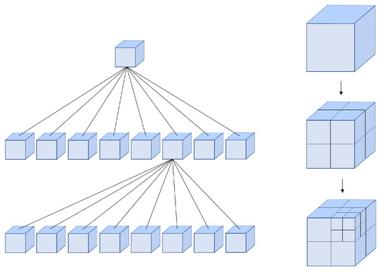 In order to better manage the point clouds, an octree [] structure is maintained. Octree is a tree-like data structure used to describe three-dimensional space, each node of which represents a volume element of a cube. A parent cube can be at least cut into eight equal child cubes. Such the number of child nodes of any node in the tree cannot be anything but eight or zero. The volume elements represented by the eight child nodes are added together to be equal to the volume of the parent node. The resolution defines the size of the smallest voxel. A basic structure of octree is as shown in Figure 5.